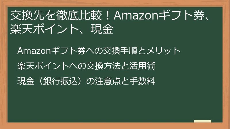 - 交換先の種類:Amazonギフト券、楽天ポイント、現金など、交換先によってレートが異なる。