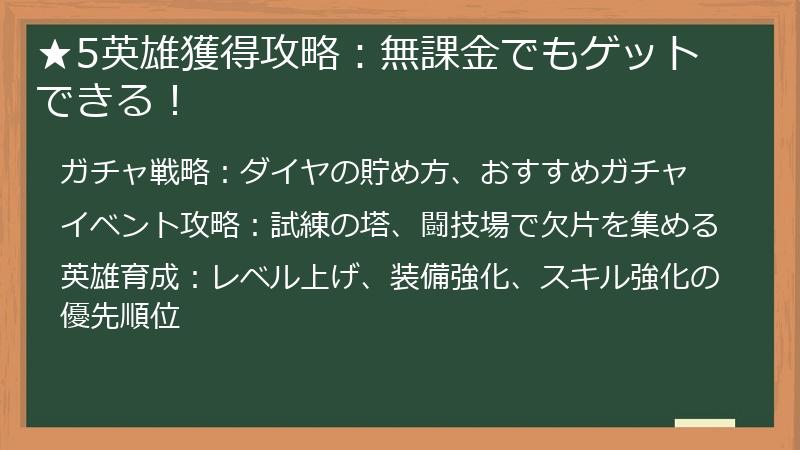 英雄ロビーでのガチャだけでなく、試練の塔や闘技場などのイベントで★5英雄の欠片を集めるのも有効な手段です。