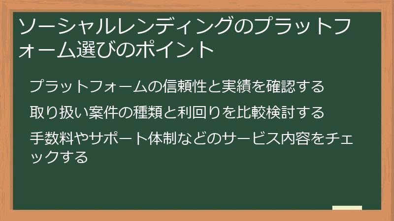 担保がある案件は、貸し倒れが発生した場合でも、担保を売却することで元本の一部または全部が回収できる可能性があります。 - プラットフォームの選定:
