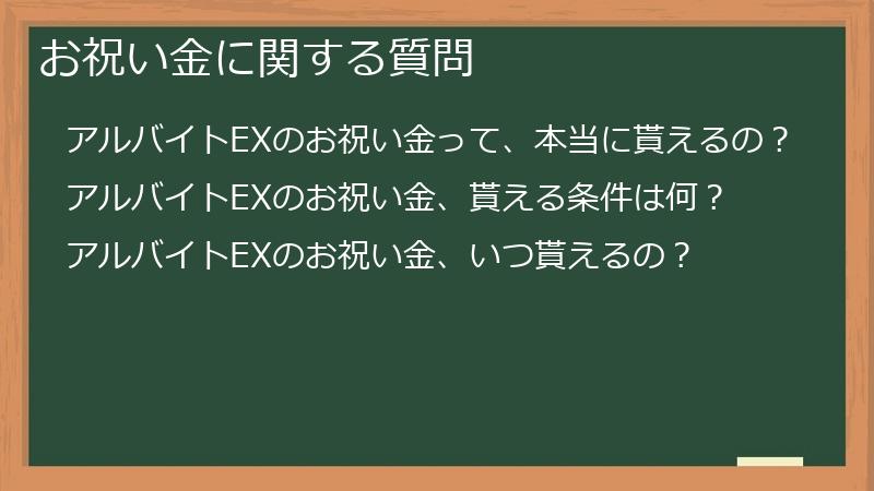 ここでは、アルバイトEXのお祝い金制度について、よくある質問をまとめ、詳しく解説していきます。。