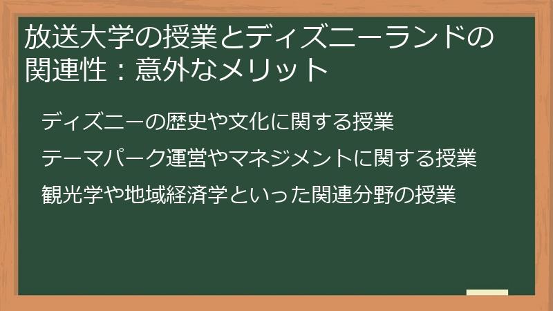 放送大学は、学費の安さや学割の利用以外にも、多くのメリットがあります。 特に、学習による自己投資効果は、金銭的なメリット以上に大きな価値を生み出します。 本項では、学割以外の放送大学のメリット、特に学習による自己投資効果について解説します。 ディズニーランド旅行とは直接関係ないようですが、人生を豊かにする上で重要な要素です。 将来的なキャリアアップや、豊かな人生を送るための知見を深める機会として、放送大学入学を検討してみてはいかがでしょうか。